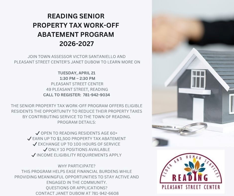 The Town of Reading and the Pleasant Street Center are pleased to announce that applications are now open for the 2026–2027 Senior Property Tax Work-Off Abatement Program. This program offers eligible residents age 60 and older the opportunity to reduce their property tax bill by contributing service to the town.